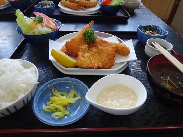 ミックスフライ定食をオーダー。沖縄に着いて1時間で既に腹一杯・・・