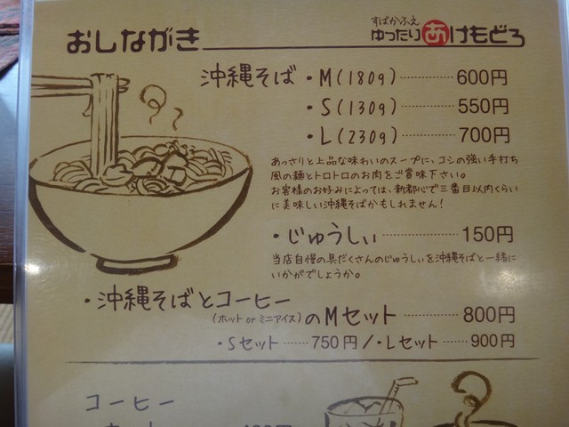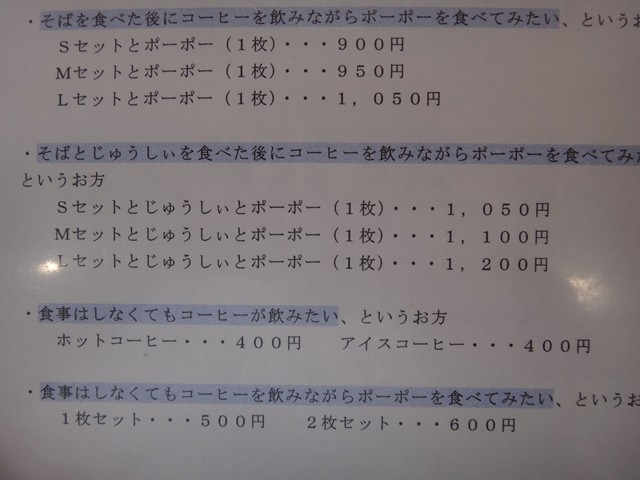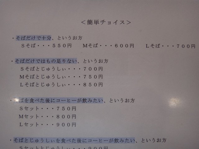 注文は、分かりやすいメニューのチャートに従い、そばとじゅうしぃを食べた後にコーヒーが飲みたい、というお方を選択。
