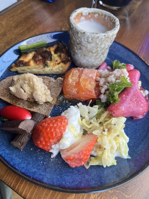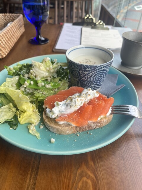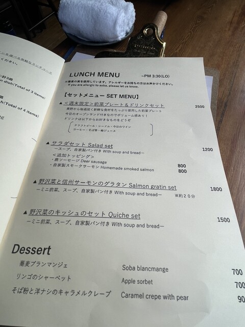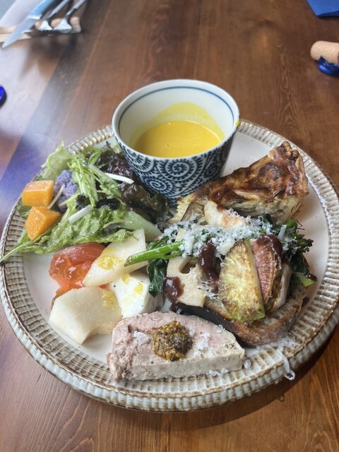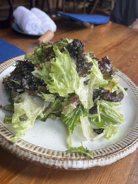 ランチセットはこの店の特徴を良く表している。長野の食材を使った、サラダ・オーブントースト・キッシュ・カボチャのポタージュ・コーヒーからなる。キッシュとサラダは特に好き。アラカルトの方は盛り盛りのグリーンサラダから、好き過ぎて一気に食べてしまう。ケールやカボチャが入っており、野菜の味が濃い。そばの味とコメ油のドレッシングが濃い野菜達を優しくつつんでいる。