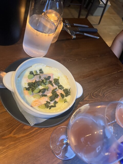 軽めに、でも上質な食事とワインが味わいたくなり平日の夜に訪問。食事はキッシュ、サーモンのムニエとポップコーン、飲み物はグラスのロゼ、白、IPAビールをお願いした。