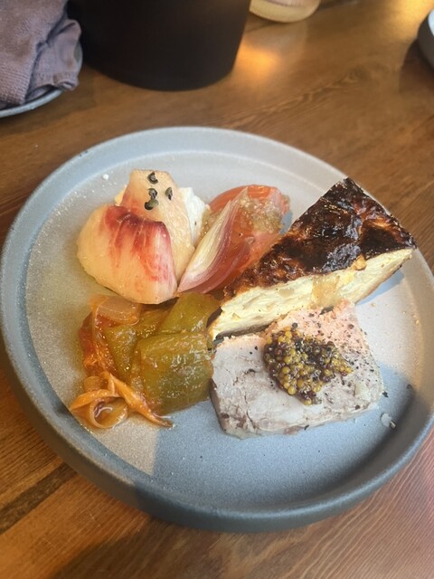 ・前菜の盛り合わせ→信州サーモンマリネ、野沢菜キッシュ、パテドカンパーニュ、実山椒が振られた「もも」とモッツァレラ、ラタトゥーユとミニガスパッチョ。どれも食材が吟味され、素材の味が引き立てられている。和を得意とするシェフの真骨頂が随所に伺える。