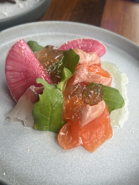 ・素麺→締めに注文。サーモンの骨と野沢菜で出汁をとったとのこと。ルックスも美しい。