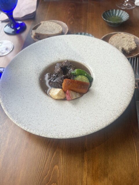 信州サーモンはイワナも添えられ、信州野菜が彩りを豊か。ジュレが程良く全体をまとめていた。舞茸は火の通りが絶妙で、ラクレットをまぶした焦げた香りが美味しさを引き立てていた。あと黒胡椒のアクセントも効いていた。