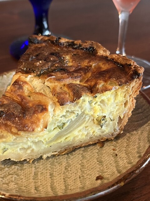 サーモンは肉厚で優しくマリネされている。付け合わせの大根は美しいだけで無く微かな酸味がサーモンと良く合う。キッシュは安定の美味しさ。こんがりサクサクの生地と玉ねぎの優しい甘さが温かく合う。