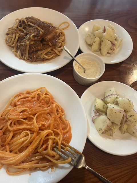 鰯のマリネは2匹入っていて、キッチリと酸っぱいところがいい。レモン豚はジューシーで肉の味が濃い、安定の美味しさ。ミートソースは味わい深くペンネとの相性がいい。ハウスワインは白・赤それぞれ2種から選べるが、フリウリのシャルドネが特に良かった。