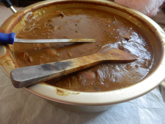 鍋に市販のルゥと、骨付きチキンの残り全部を投入