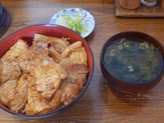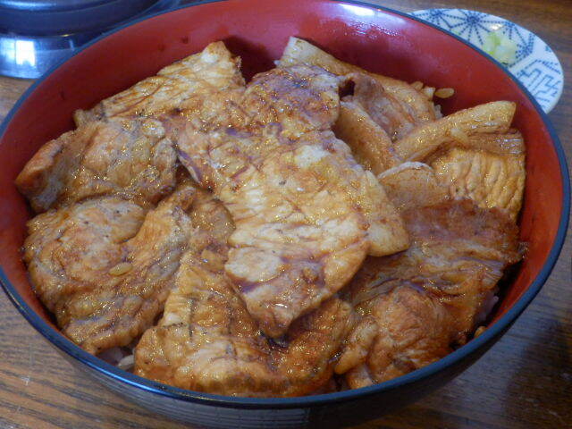 豚丼は、豚バラ薄切り肉と、甘口ダレで煮たもの