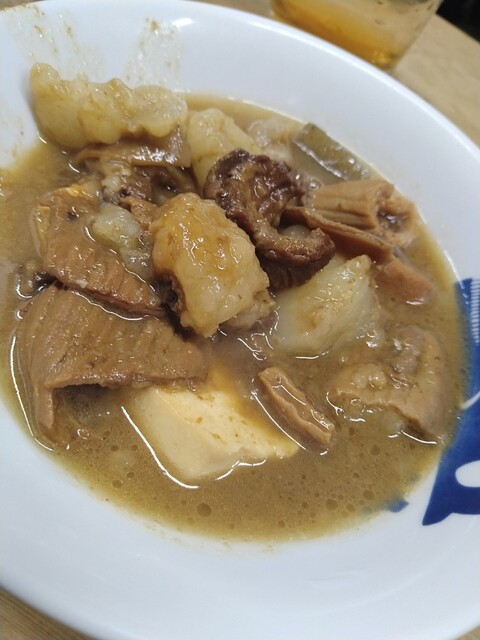 で、目的の煮込み。マルチョウを始め、よくわからない部位と豆腐が甘辛く煮込まれており、とにかくこれが美味い。特に冬場は最高ですね。すぐに冷めてしまうので、アッツアツの内に口の中に放り込み、「火傷するんじゃないか」くらいに感じたところでチューハイを流し込む、と。となりのおそらく捕鯨船初めてのカップルも煮込みを注文して「ウマ!」と感激してたので、やっぱりここの煮込みは万人受けする良いもつ煮込みですね。