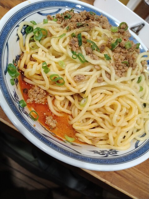 おおぅ、うめぇ! 結構辛そうな見た目とは裏腹に、辛さは控えめであっさり系の担々麺ですね。いわゆるバチバチの四川風というより、ピリ辛肉そぼろの和え麺、みたいな感じ。でもこれが美味いんすよ。しっかりひき肉に味が入ってて、それが麺に絡みこんで調味料兼具材、みたいに機能してるし、ネギの食感も良い。そして以外に働き者なのがキュウリの漬物。カリっとした食感と、塩気が効いた感じが箸休めというか、口をリセットする感じで実に良いです。