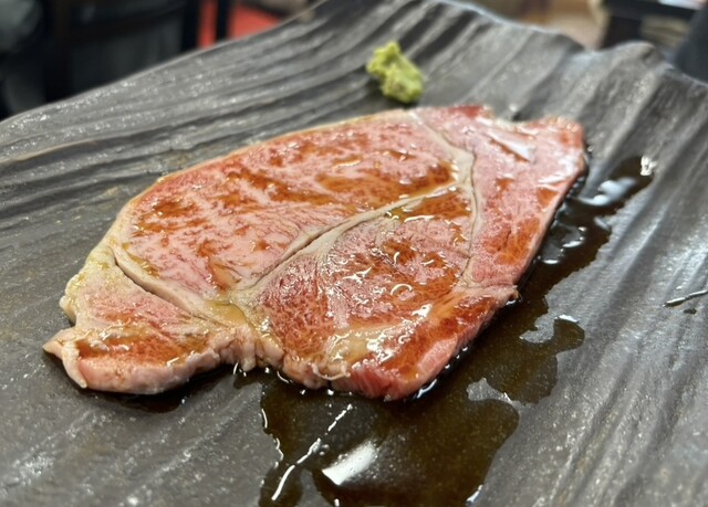 ステーキのような厚切り肉。サッと火を通し、わさびをつけていただく。