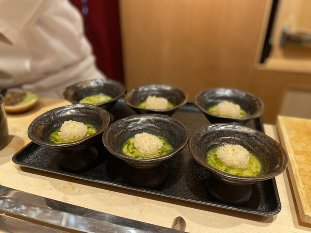 ぷっくらとした丸みと艶を帯びたものに、鮮やかなオレンジ色の雲丹を乗せている先付けが、カウンター越しに見える。