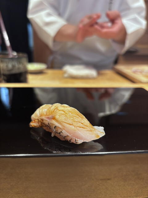 生ではなく、ほんの少し火で炙られている握りは、皮の香りがとてもよく、脂のうまみも引き出されている。