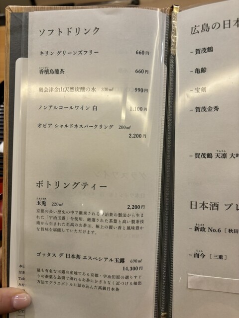 料理は日本酒とのペアリングが楽しめ、広島の日本酒はグラス1杯770円からとリーズナブル。