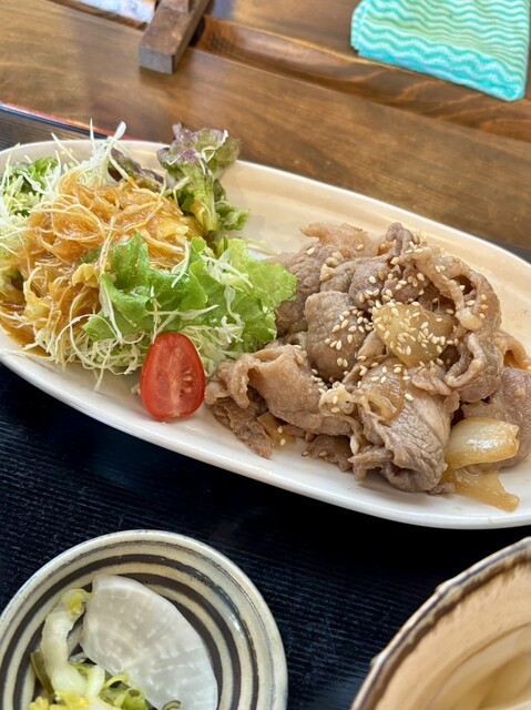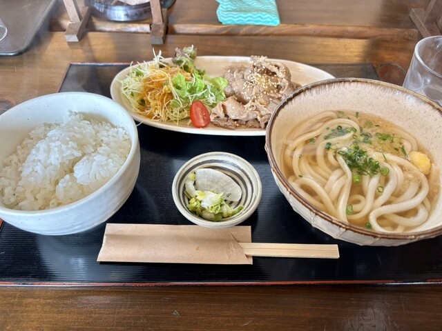 ごはん、かけうどん、お漬物にメインのお皿。しょうが焼きだけでなくてサラダもたっぷりで体にも良さそう。
