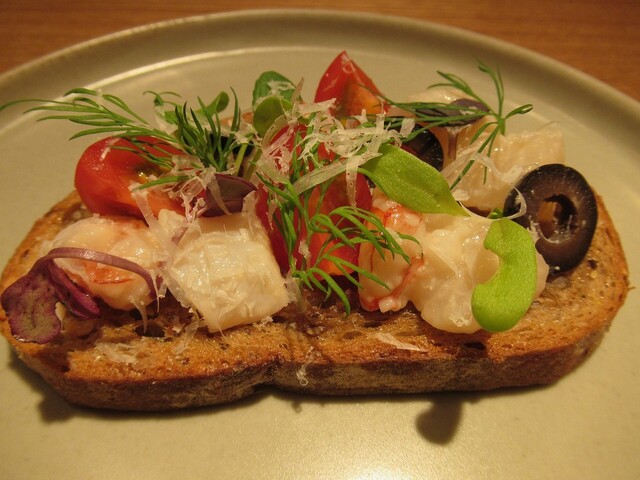 その上にホタテ、エビ、ミニトマト、オリーブ、