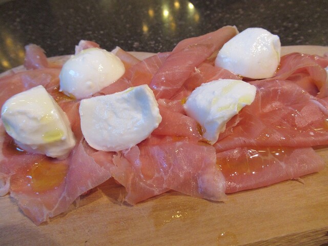 まずはパルマ産生ハムと水牛モッツァレラチーズ。