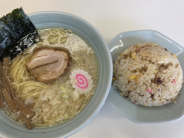 お得なラーメンと半チャーハンのAセット1150円を背脂増しでオーダー。