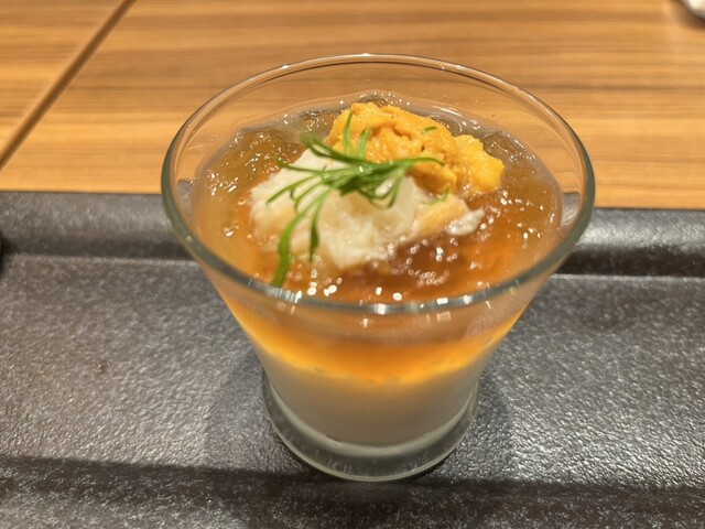 ウニ、ズワイガニ、季節のムースとコンソメジュレ