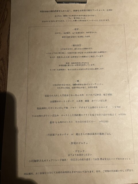 個人史上初星5つです!コスパ¥2500でこれだけつくって最高じゃないですか?(写ってないけどドリンクもついています)お野菜を前面に推しているだけあり、前菜のお野菜は彩とりどりどれも美味しかったです。お店も大丸の隣で立地最高!スタッフのサーブも文句のつけどろこありませんでした。1週間後に又再訪してしまいました(^^;;