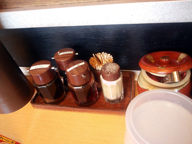 卓上に、”割り箸”、”ラー油”、”ギョーザのたれ”、”ラーメン・チャーハン”(これを味見するのを忘れたけど、なんかタレだろう)、”コショウ”、ツマヨウジ”(写真参照)