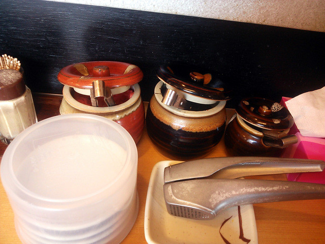 更に、”紅ショウガ”、”辛子高菜”、”ニンニク”&”ニンニク潰し”、”小皿”、”箱ティッシュ”、”水差し”(写真参照)