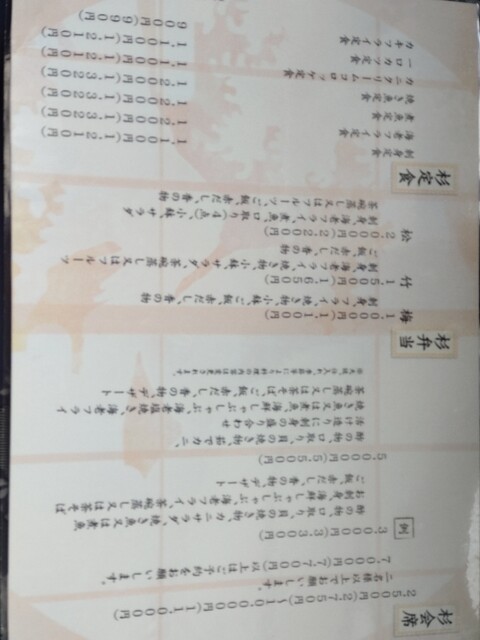 早速注文です。まず外せないのが茹でワタリガニ、ほかにはシャコ、タコ、貝が食べたいですと伝えたところ、タコはありませんがほかはあります。予算内で色々できますよと、メニューの相談開始。これって、すごくないですか?「杉会席」4000円コースで、一部自分の食べたい希望を入れて決めてもらえるのです。メニューは次のとおり。