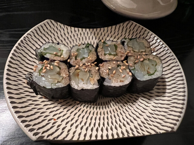 今回は、冬の味覚、コッペかにの巻き寿司が目当てです。なみだうにの巻きずしと合わせると、そのビジュアルインパクトはなかなか店内でも注目の的になります。もちろん、凄く美味しかったです。