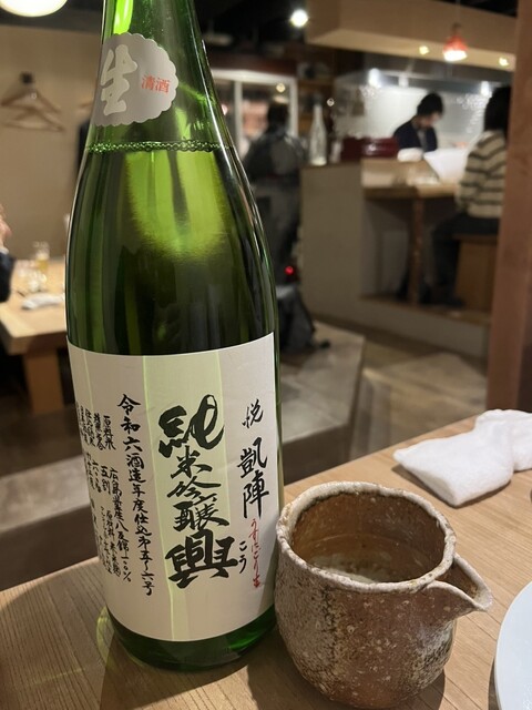 さ、そんなわけでお店はビルの2階。入るとカウンターと、奥に掘り炬燵、さらに4席のテーブルが二つ。全体的に広めに椅子の間隔を取ってあるのでなんだゆっくりと贅沢な空間に感じます。