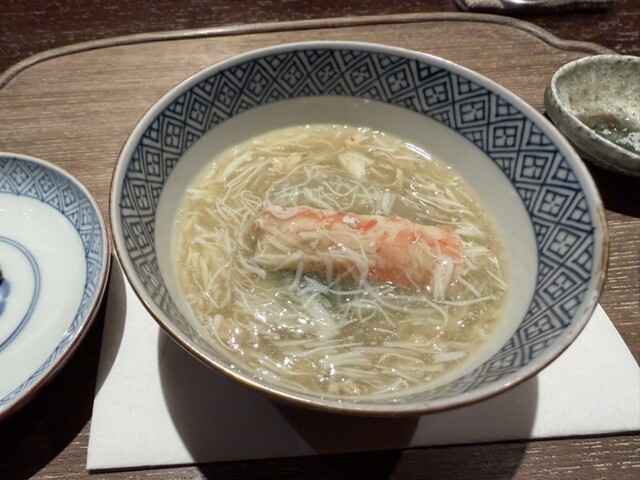 椀物: 間人(たいざ)蟹、源助だいこん、難波葱。希少な食材のコラボ。