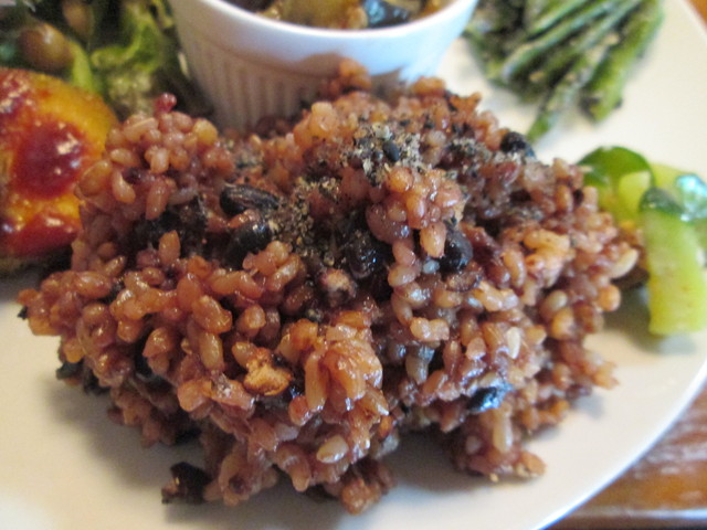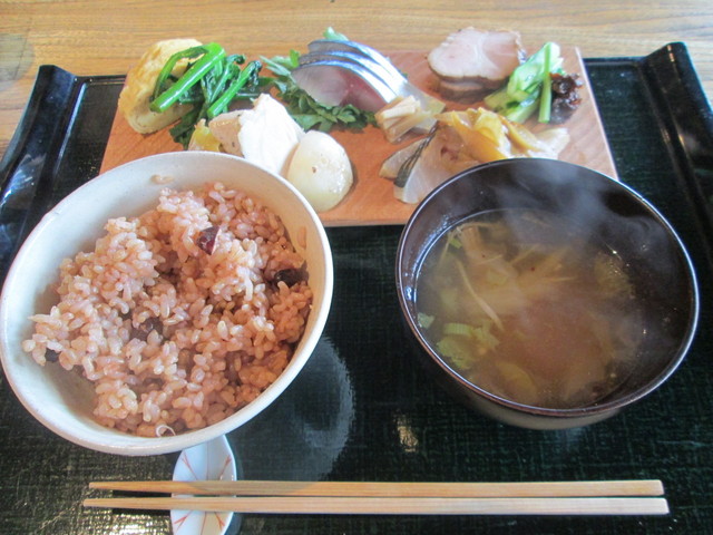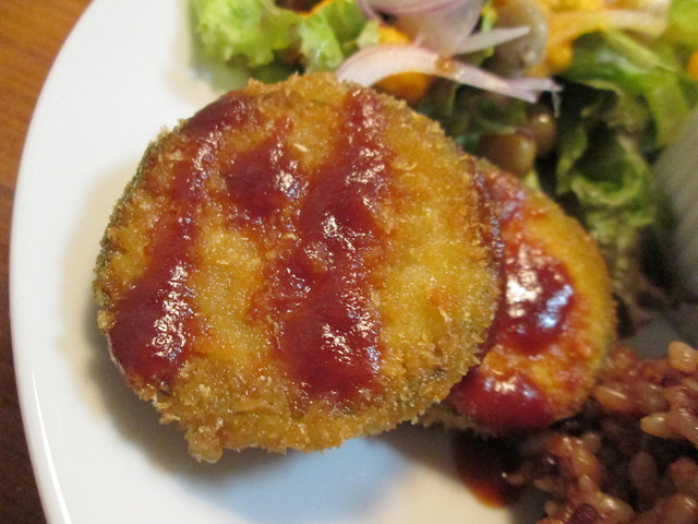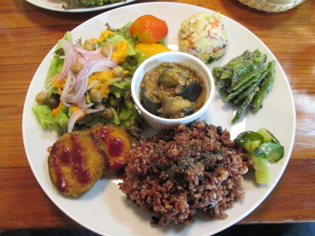 提供時、おぉ!꒰✪ૢꇵ✪ૢ꒱ෆ⃛ෆ⃛ೄってなりました。7~8種類のお料理から構成されたワンプレート。美味しそうでしょ~?円いお皿に所狭しと、然もボリューミー♪手の加え加減に時間をかけている様が手に取って解ります。ではポテトサラダから。こんなに色とりどりなのは初めてで良く冷やされていて◎中央茄子の煮物に、多分手作りで美味しいドレッシングとナッツがかかったサラダ、インゲンの料理、紫色の僕達が好きな玄米。ズッキーニのフライはホクホク熱々でビックリ美味。あぁ〜♪幸せなワンプレート。