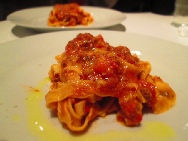 《2人で1つの注文だからなのかパスタは初めからお分けすることができますが?と言われましたので嬉しくお願いしました。こんな事言われたの初めて感謝感激僕秀樹。1杯のかけそば的な恥じらい(笑)麺はタリアテッレか、ニョッキに出来ますが前者にしました。提供後早速。麺はモチモチとかコシがあるとかはないですが、さらっと食べやすい平打ち麺。ミートソース、ウンマです。両者絡めてハーモニー。》