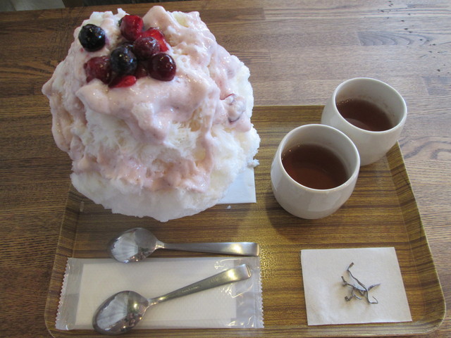 ◻︎この手のかき氷は提供されると同時に、わぉ!となりますね。こんもり氷美味しそう。実はチョイスしたこの味には期待していなく提供されるまで味の想像はついていて違うのにすれば良かったかなぁ?なんて思っていました。しかしまたコレが旨い!ヨーグルトなので酸味が強いと思いきや上手い具合に軽減されていて氷もふわっふわで滑らか。また、内部にはバニラアイスがありホントは何処かで食べた記憶で味がバラバラな印象があったバニラアイス。これは氷と一体化していてハーモニー度数が目まぐるしいです。お茶や、塩昆布も嬉しいですね。