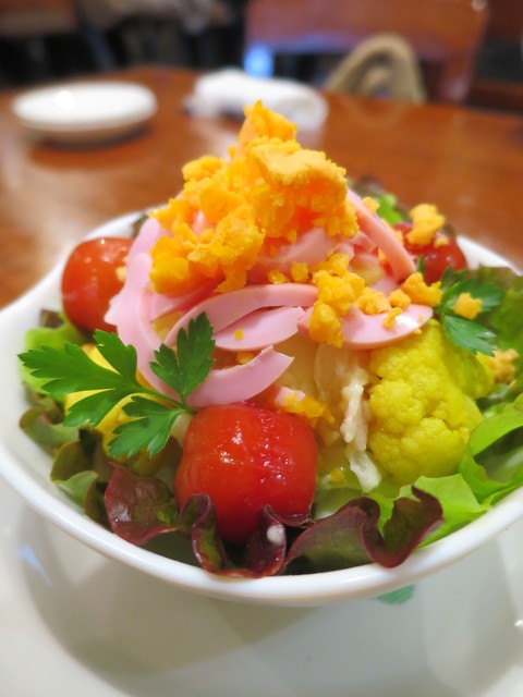《お皿がキンキンに冷やされています。ドレッシングは足りるか足りないか…いや、足りているはず…な量でお上品な味覚印象です。おうちではサラダやお浸しには調味料を使わないのでワタクシは好きです。》