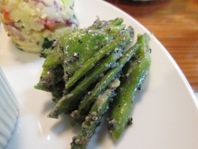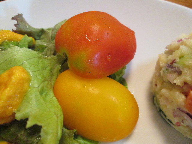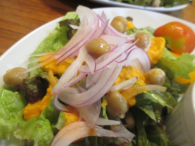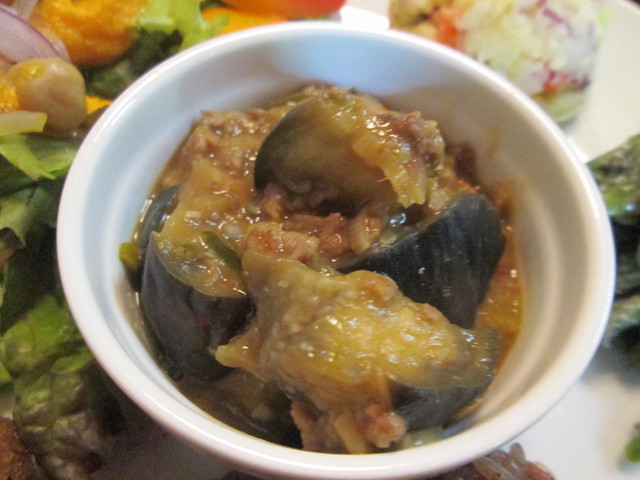 提供時、おぉ!꒰✪ૢꇵ✪ૢ꒱ෆ⃛ෆ⃛ೄってなりました。7~8種類のお料理から構成されたワンプレート。美味しそうでしょ~?円いお皿に所狭しと、然もボリューミー♪手の加え加減に時間をかけている様が手に取って解ります。ではポテトサラダから。こんなに色とりどりなのは初めてで良く冷やされていて◎中央茄子の煮物に、多分手作りで美味しいドレッシングとナッツがかかったサラダ、インゲンの料理、紫色の僕達が好きな玄米。ズッキーニのフライはホクホク熱々でビックリ美味。あぁ〜♪幸せなワンプレート。