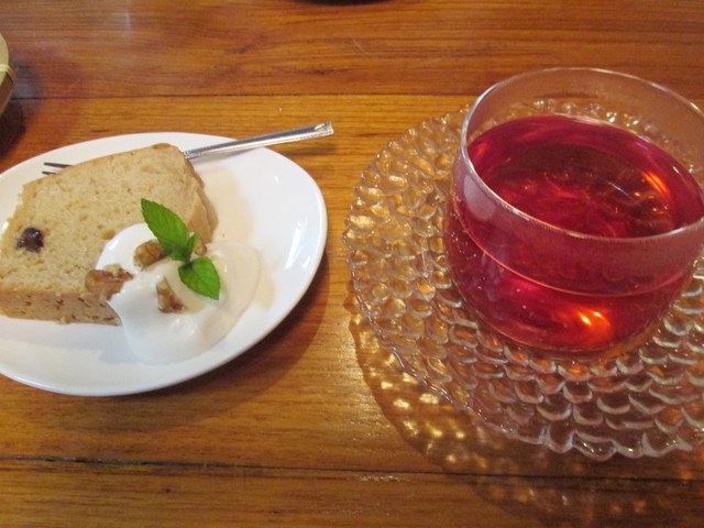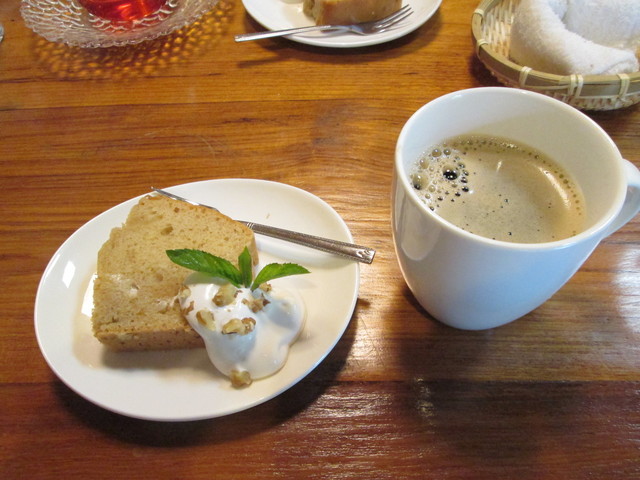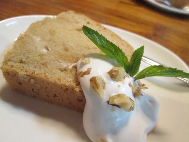 イチジクとクルミのパウンドケーキ。添えられた生クリームは植物製品を使わない液体に近いようなオーガニック。ケーキはほのかにメープルシロップが効いていて生クリーム共々美味しいです。