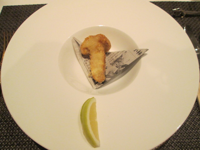 魚料理。パリパリアミアミのポテト?で挟んであります。