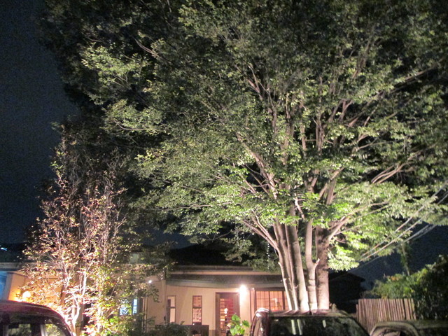 ライトアップが綺麗な木々の隙間からお店が見えます。