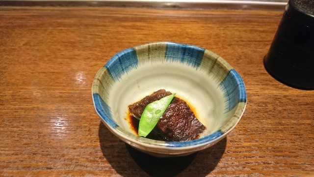 中継ぎにお酒「赤兜」一合を頂きます。「浅利の白和え」に合います。「つくね」は盛り付けも可愛らしいですね。