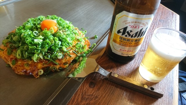 お二人様でしたので、オーダーは店名のついた「長田屋焼」と「デラックス」。予め聞いておいてくれるので、着席さえすれば料理は待たずに到着するのが嬉しいですね。瓶ビールを1本だけ頂きながら、開始しました!
