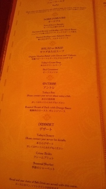 コースは、<オードヴル><サラダ または スープ><アントレ><デザート>から選ぶことができます。