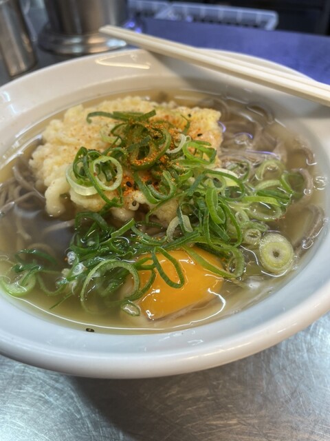 かき揚げそばに生卵入り