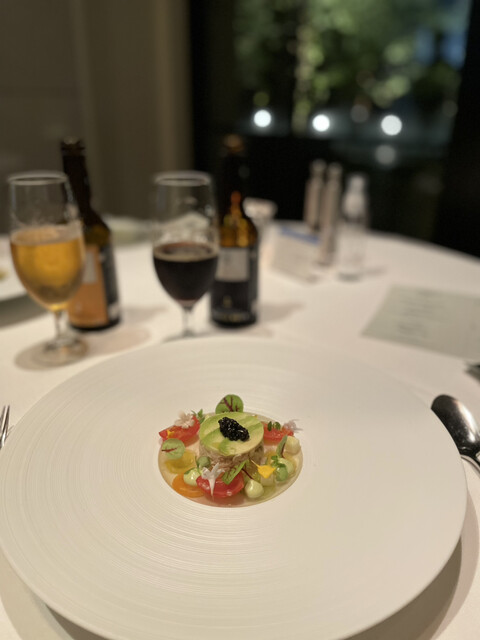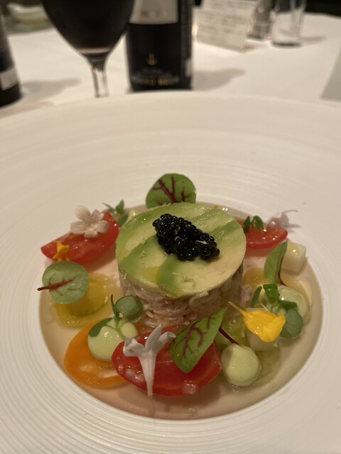 毛蟹のサラダとトマトのジュレ キャビアを添えて アボガドのクリームとリンゴのコンフィ