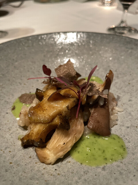 ポルチーニ茸のリゾットと肝の旨味を絡めたアワビのタリアータハーブのソースとトリュフのラペ