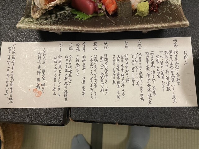 大好きな『生牡蠣』は出ませんでしたが、内容は写真の『お献立』の通りです