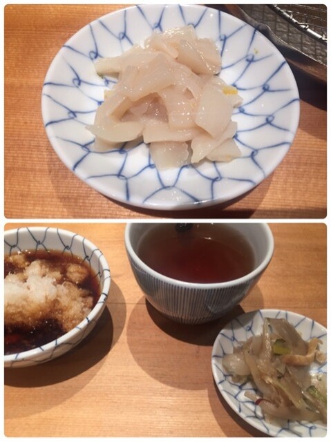 天ぷらがくるまでは、ゆずイカやきんぴらを自由に食べながら待ちます。このゆずイカとても美味しい(((o(*゜▽゜*)o)))お代わり自由です。