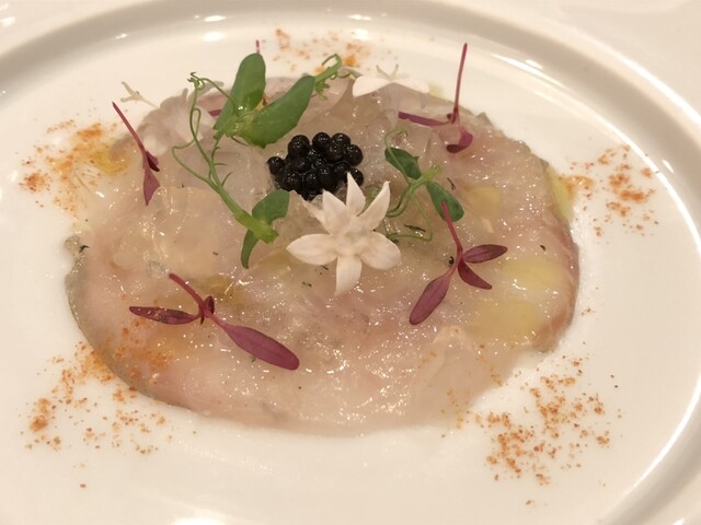 鯛・鯵・鴨のカルパッチョ、ホタテとピュアホワイトコーンポタージュ