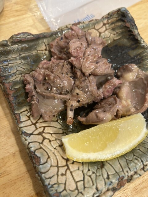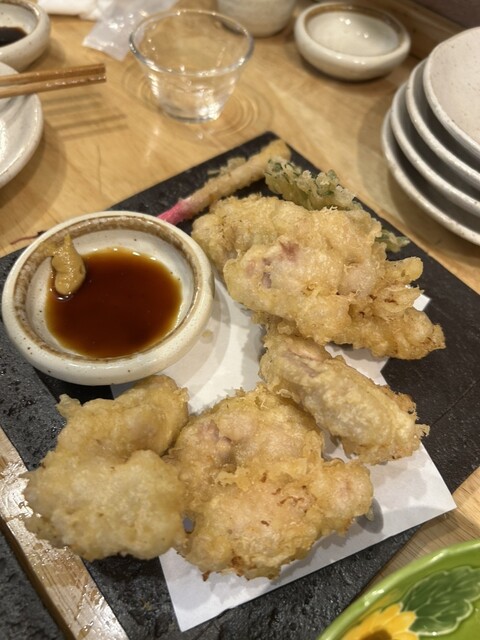 立ち飲み系の中では私の一位です。この日は時間にも胃袋に余裕があったのでいつもの魚の天ぷらなどに加えて地鶏料理も!海鮮メニューの中にある地鶏メニュー、気になっていました。はい、当然美味しいです〜。加齢で小さくなった胃袋が憎らしい…。