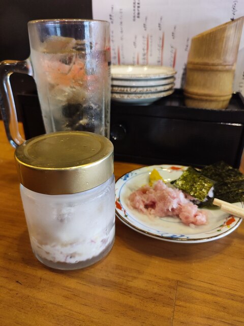 お通しのネギトロ、ハイボールのピッチャー、燻製ポテサラ、串2本で1140円。かなり満足です。素敵な時間を過ごすことができます。