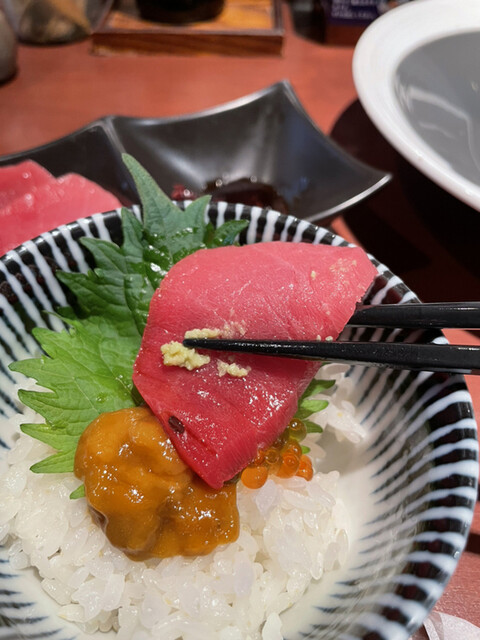 まぐろは、赤身、中トロの大きめの切り身が各三切れと贅沢に盛り付けられています。サービスメニューとしてもちょっとやりすぎって感じの大サービス。ご飯の上には塩うにに加えイクラまで乗って¥800!!