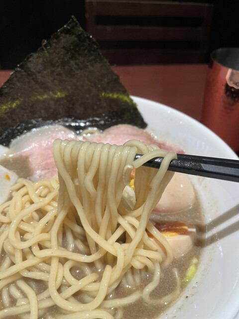 加水率高めの中太麺のもっちり食感も絶妙で、スープとの相性も抜群。